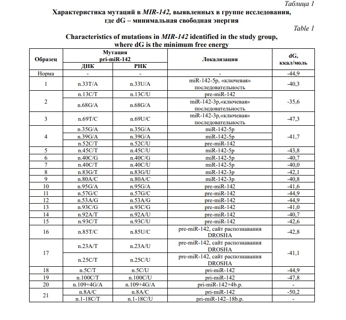 Одним из важных результатов работы с данными проекта TCGA стал тот факт, что MIR-142, кодирующий зрелые функционально активные цепи miR-142-3р и miR-142-5р, является единственным геном микроРНК человека, который рекуррентно мутирует при гемобластозах: остром миелоидном лейкозе, хроническом лимфолейкозе и различных типах В-клеточных лимфом [18]. Вместе с тем, все проведенные в настоящее время исследования мутаций в данном гене основаны на анализе нескольких десятков биообразцов опухолей. При этом в работах практически не уделено внимания оценке функционального эффекта выявленных изменений.
