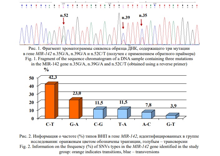 Ген MIR-142 амплифицировали описанным ранее методом [21] с использованием следующих праймеров: 5'-CTCACCTGTCACACGAGGTC-3’ и 5'-CTCTTGAGCAGGAGGTCAGG-3’. Получали продукт длиной 231 п.н., включающий всю последовательность первичного транскрипта miR-142 вместе с фланкирующими областями длиной около 25 н.п. Продукты ПЦР очищали с использованием микроколонок с SephadexТМ G-50 medium и секвенировали по Сэнгеру с использованием BigDye Terminator v3.1 Cycle Sequencing Kit и полимера POP-7 (Applied Biosystems, США) на генетическом анализаторе ABI 3500 (Applied Biosystems, США). Полученные хроматограммы были проанализированы с применением программного обеспечения Chromas. Все мутации были обозначены в соответствии с нумерацией нуклеотидов в первичном транскрипте микроРНК.