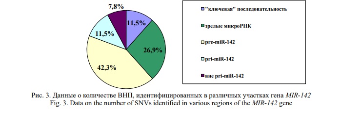 Анализ распределения ВНП по последовательности гена показал, что только 3-и из них (11,5%) были локализованы в «ключевых» последовательностях miR-142-5p и miR-142-3p (1 и 2 случая, соответственно), тогда как 7 (26,9%) – в других участках последовательности зрелых микроРНК вне сайтов связывания с мРНК-мишенями (4 и 2 случая, соответственно). Одиннадцать (42,3%) ВНП были локализованы в последовательности pre-miR-142 вне участков, кодирующих зрелые цепи, в том числе 3-и – в сайте распознавания DROSHA. Еще три (11,5%) ВНП – в последовательности pri-miR-142 за пределами участков, кодирующих микроРНК-предшественника. В двух случаях (7,8%), выявлены однонуклеотидные замены в непосредственной близости к 5/- и 3/-концам pri-miR-142 (Рис. 3).