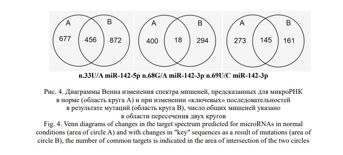 Анализ выявил значительное изменение профиля предсказанных взаимодействий микроРНК-мишень (Рис. 4). В случае n.33U/A ключевой последовательности miR-142-5p имело место увеличение (с 1133 до 1328), тогда как в случае n.68G/A и n.69U/C ключевой последовательности miR-142-3p – уменьшение (с 418 до 312 и с 418 до 406, соответственно) числа потенциальных мишеней. При этом наблюдалось значительное изменение спектра взаимодействия, особенно выраженное для n.68G/A miR-142-3p. Согласно биоинформатическому предсказанию, при данной мутации сохраняется контроль лишь над 18/418 (4,3%) канонических мРНК мишеней, что значительно меньше, чем при n.69U/C miR-142-3p (145/418, 34,7%) и n.33U/A miR-142-5p (456/1133, 40,2%).