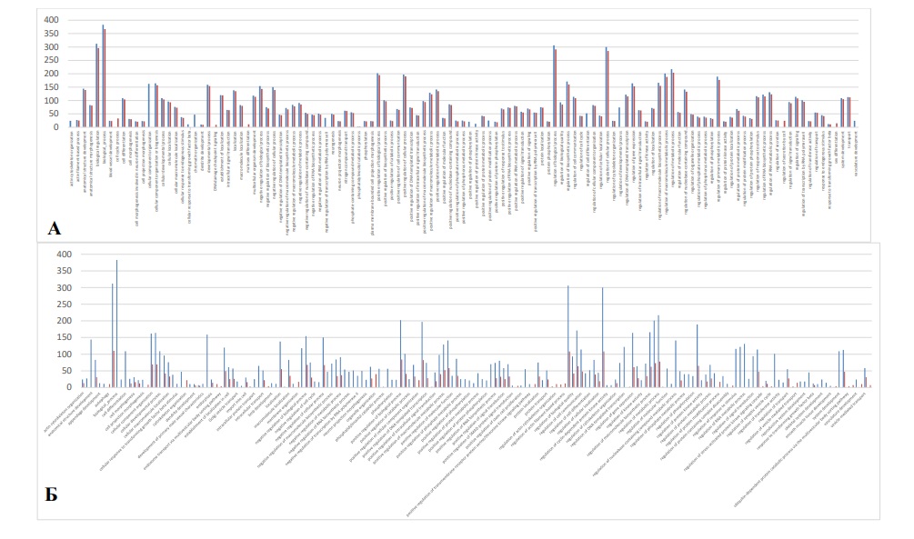Предсказание insilico генов-мишеней для каждой из «ключевых» последовательностей микроРНК было выполнено с помощью специального онлайн-инструмента miRDB [22]. Для построения диаграмм Венна был использован электронный ресурс https://www.semestr.online/graph/venn.php#vennhand [23]. Для определения функции генов-мишеней микроРНК был проведен анализ обогащения терминов генных онтологий (GOenrichmentAnalysis) молекулярных функций и биологических процессов с помощью PANTHER [24] на базе биоинформационного ресурса Gene Ontology (GO; http://www.geneontology.org) [25]. Результаты со значением p<0,05 после поправки на множественную проверку гипотез (FDR – False Discovery Rate) считались статистически значимыми. Для предсказания вторичной структуры «шпильки» микроРНК и расчета ее минимальной свободной энергии (dG) использовался UNAfold web server [26].