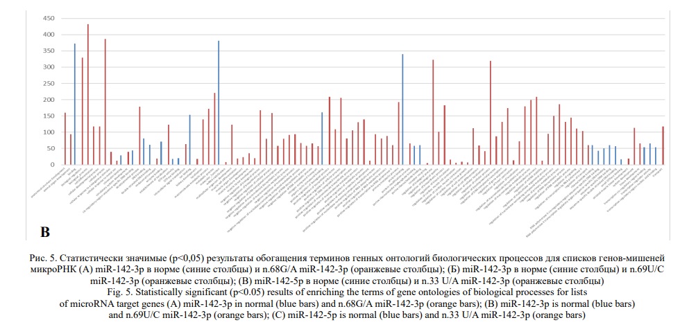 каждого набора генов-мишеней (референсного и измененного в результате каждой из мутаций). Анализ выявил статистически значимое (p<0,05) обогащение различных наборов терминов генных онтологий для miR-142-3p в норме и при n.68G/A или n.69U/C, а также для miR-142-5p в норме и при n.33U/A (Рис. 5).