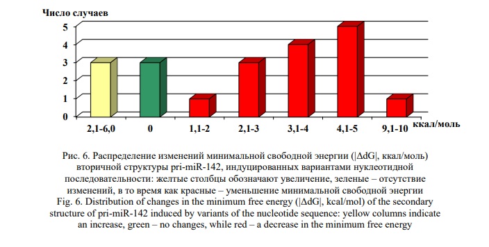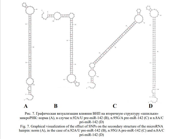 Заключение. Частота мутаций в гене MIR-142 в группе исследования составила 16,8%. При этом в каждом пятом случае имели место множественные однонуклеотидные замены, что косвенно свидетельствует о возможности феномена катаэгиса при ДВККЛ в области расположения данного гена. В целом полученные результаты свидетельствуют о существенном влияние ВПН в «ключевых» последовательностях на переключение генов-мишеней зрелых цепей изучаемой микроРНК, тогда как самые различные ВНП способны нарушать трехмерную организацию «шпильки» микроРНК предшественника. Необходимы дальнейшие функциональные исследования для подтверждения влияния предсказанных изменений термодинамической стабильности и вторичной структуры на биогенез зрелых цепей микроРНК.