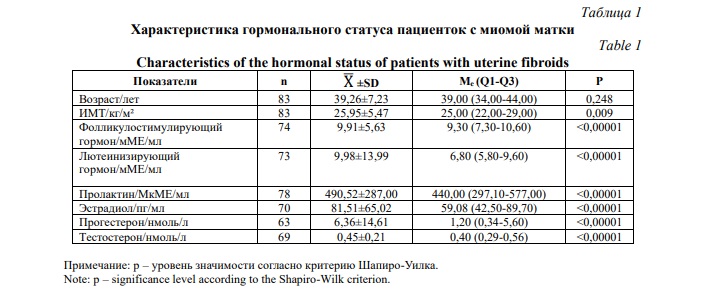 Результаты и их обсуждение. Выполнен анализ показателей гормонального профиля 83 женщин, имеющих миому матки. Средний возраст исследуемой группы был равен 39,26±7,23 лет, среднее значение ИМТ составило 25,95±5,47. Показатели гормонального профиля пациенток с миомой матки приведены в Таблице 1.