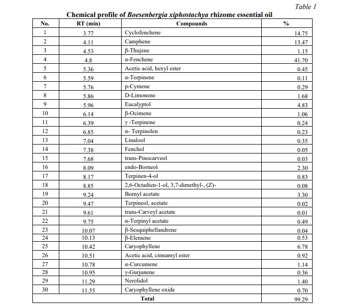 Five hundred grams of fresh rhizomes were washed, sliced into small pieces and submerged in 2.0 liters of distilled water. Steam distillation was carried out for 3 hours at normal pressure in a Clevenger apparatus. About 0.3 mL of essential oil was collected and stored in a dark bottle at 4℃ until analyzed.