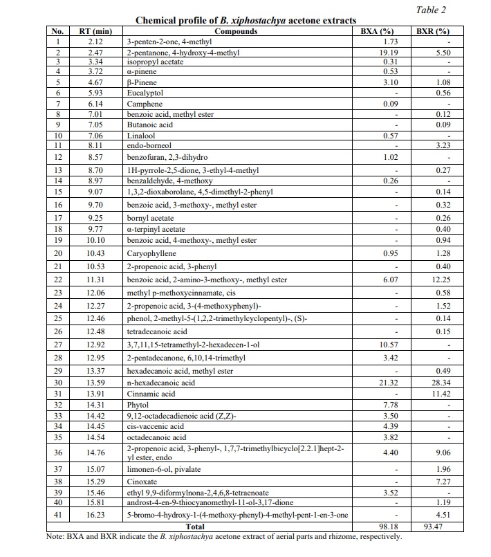 Table 2 presents the chemical composition of the acetone extracts derived from the aerial parts and rhizome of B. xiphostachya with a total of 21 and 27 compounds, respectively. The extract from the aerial parts primarily consists of n-hexadecanoic acid (21.32%), 2-pentanone, 4-hydroxy-4-methyl (19.19%), phytol (7.78%), 3,7,11,15-tetramethyl-2-hexadecen-1-ol (7.63%), and benzoic acid, 2-amino-3-methoxy-, methyl ester (6.07%). Meanwhile, the rhizome extract contains n-hexadecanoic acid (28,34%); benzoic acid, 2-amino-3-methoxy-, methyl ester (12,25%); cinnamic acid (11,42%); 2-propenoic acid, 3-phenyl-, 1,7,7-trimethylbicyclo[2.2.1]hept-2-yl ester, endo (9,06%); and cinoxate (7,27%) as the major compounds. The presence of identified compounds in the rhizome acetone extract differs significantly from that in the rhizome hexane extract. The main compound recorded in the latter was 3,6-dimethoxy-2-ethylbenzaldehyde (38.43%) [27]. Nevertheless, the high concentration of n-hexadecanoic acid in B. xiphostachya extracts suggests the presence of beneficial biological activities, such as antibacterial, antioxidant and anti-inflammatory properties, as reported in previous studies [32, 33]