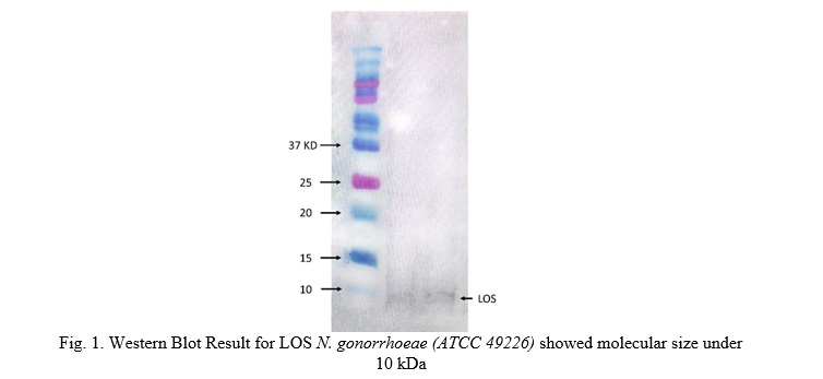 Western blotting was used to identify LOS. For the SDS-PAGE, a 48% polyacrylamide gel was prepared, and samples with equal protein amounts were loaded into the wells. Electrophoresis was run at 100 V for 1-2 hours. The gel was moistened with transfer buffer and arranged in a transfer cassette for protein transfer onto the nitrocellulose membrane. The membrane was washed, molecular weight bands were marked, and then incubated in blocking solution for 1 hour at room temperature. The membrane was then incubated with primary antibody solution in 1x TBST and 1% BSA for 1 hour at room temperature, followed by three 10-minute washes with 1x TBST. Next, the secondary antibody solution in 1x TBST and 1% BSA was added for 1 hour at room temperature, followed by additional washes. For protein detection, the membrane was incubated with ECL substrate for 1-5 minutes, placed between plastic layers, and exposed to autoradiographic film. The film was then aligned over the blot to visualize the molecular weight ladder (Fig. 1).