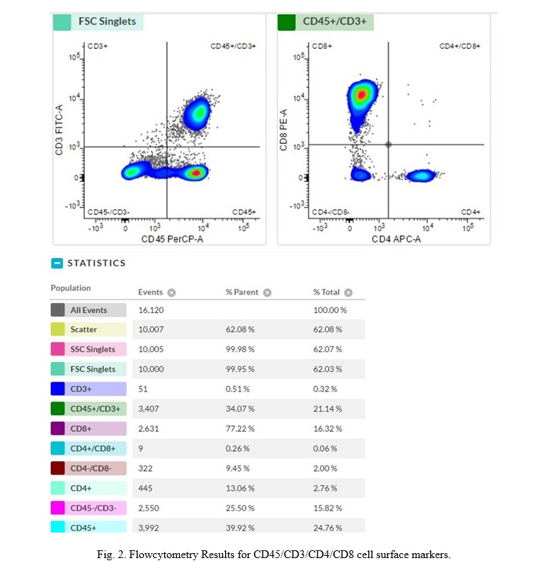 After isolation of PBMC, the lymphocytes were cultured. The identification of cell surface markers was carried out using flowcytometry to ensure the availability of lymphocyte (CD45+/CD3+/CD4+/CD8+), as shown in Fig. 2.