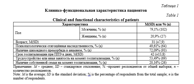 Участие в исследовании приняли 129 пациентов отделения первого психотического эпизода в возрасте от 16 до 50 лет (31±7,9 лет), прошедших комплексную программу реабилитации сроком до двух лет от начала госпитализации. Среди участников преобладали мужчины (79,1%, n=102), большая часть имела шизоидный преморбид в анамнезе (72,09%, n=93), у половины (49,61%, n=64) отмечалась наследственная отягощённость по психическим заболеваниям, а длительность госпитализации составила от 24 до 88 суток (42±13,8 дня). На момент госпитализации были трудоустроены 53,49% пациентов (n=69), имели свою семью лишь 20,16% (n=26). Клинико-функциональная характеристика представлена в Таблице 1.