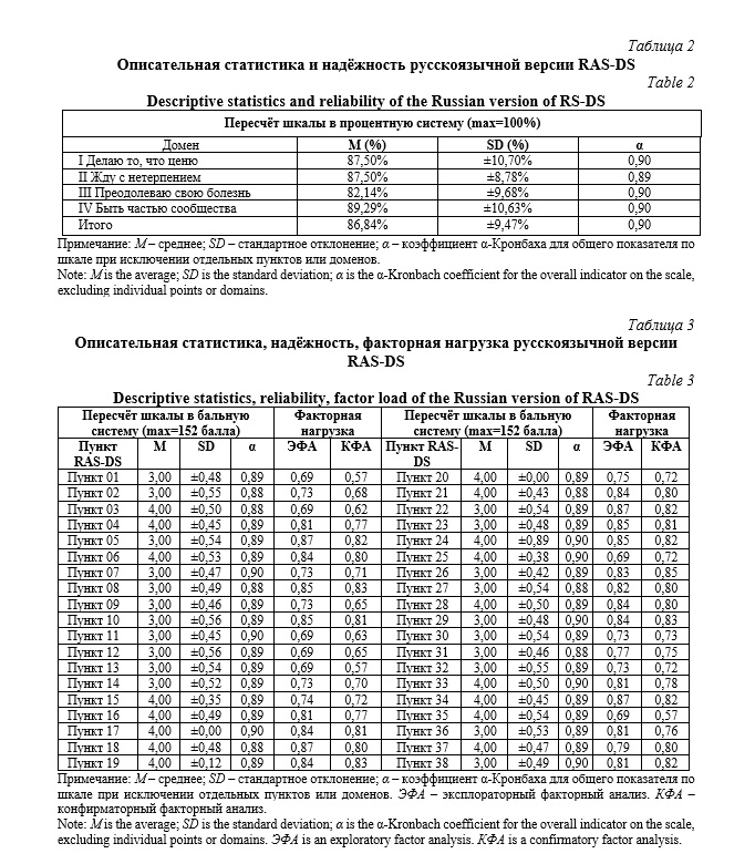 Анализ надёжности. Надежность отражает способность метода давать постоянные и точные результаты при неизменности исходных параметров. В Таблицах 2 и 3 представлена структура шкалы RAS-DS с учётом обобщения результатов по каждому домену в процентном соотношении и вариант представления данных по каждому пункту отдельно в пересчёте на баллы. Коэффициент α-Кронбаха [44, 45] для общего показателя по шкале составил значение 0,90, что трактуется как отличная внутренняя надёжность русскоязычной версии шкалы RAS-DS. При исключении отдельных пунктов шкалы и перерасчёта достоверности отмечалось снижение коэффициента α-Кронбаха, что даёт основание для анализа представленной шкалы как единого массива данных в исходной структуре и компоновке по доменам.