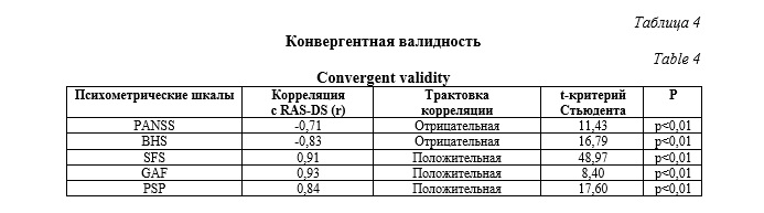 Анализ критериальной валидности. Для подтверждения корреляционной связи RAS-DS с уже валидизированными психометрическими инструментами и повышения надёжности был проведён анализ схожих конструкт. В связи с комплексной оценкой восстановления по модели «recovery» в анализ были включены 5 шкал: для оценки клинического восстановления использовалась PANSS, для оценки функционального восстановления – GAF, PSP, SFS, для оценки личностного восстановления – BHS. Была сформирована гипотеза об обратно-пропорциональной корреляции PANSSти BHS по причине оценки негативных симптомов в представленных шкалах, противоречя факту восстановления пациента. Оставшиеся шкалы прямо-пропорционально коррелируются с RAS-DS. В качестве теста на значимость был использован t-критерий Стьюдента, статистически значимая корреляция определялась при p<0,001, пороговое значение p<0,05. Корреляция определялась как высокая при r>|0,7|.Данные конвергентной валидности представлены в Таблице 4.